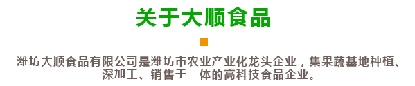 濰坊大順食品有限公司創(chuàng )建于2006年,位于中國的出口蔬菜基地安丘市,是蔬菜出口基地示范市,距青島港120公里,濰坊機場(chǎng)20公里,交通便捷,原料資源豐富。公司占地26680平方米,固定資產(chǎn)3000萬(wàn)元,員工200余人,現有VF果蔬脆片等系列產(chǎn)品80種,年生產(chǎn)能力約5000噸,年創(chuàng )外匯800萬(wàn)美元,是一家以蔬菜種植、加工、銷(xiāo)售為一體的大型農業(yè)產(chǎn)業(yè)化企業(yè)。